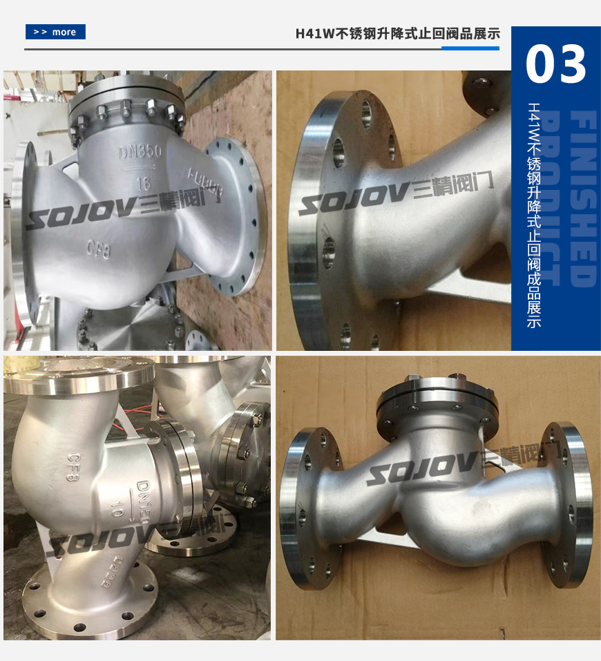 三精閥門公司生產(chǎn)的H41H/W升降式止回閥嚴(yán)格按GB12235 標(biāo)準(zhǔn)設(shè)計(jì)制造,閥瓣沿著中心定位作升降運(yùn)動, 襯套采用耐磨性能好,摩擦系數(shù)小的特殊材料制作,動作靈活可靠. 密封性能優(yōu)良。產(chǎn)品廣泛應(yīng)用于石油、化工、制藥、電力行業(yè)等各種工況的管路上。