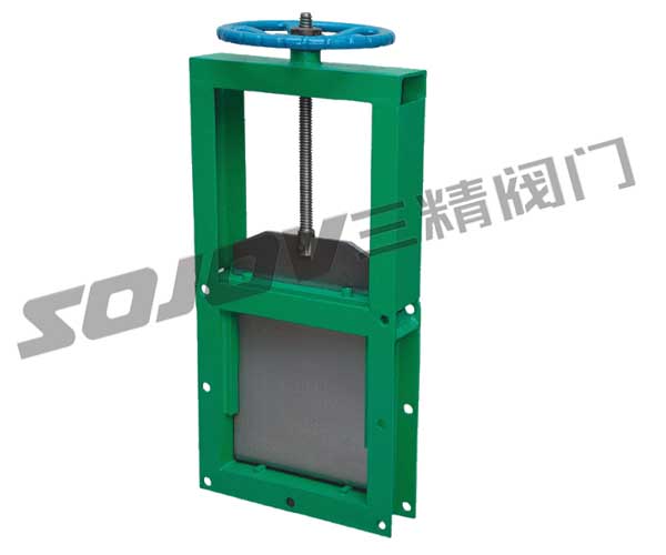 主要由框架、閘板、絲桿、螺母等零件構(gòu)成,用手轉(zhuǎn)動手輪使絲桿帶著絲桿螺母和閘板沿水平方向往復(fù)運(yùn)動,達(dá)到閘門的啟閉目的。
